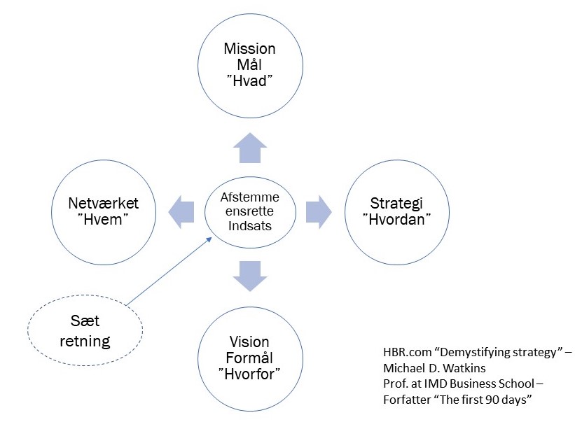 Jeg har lavet en lille ændring til Professor Watkins model, ved at ændre det han kalder ”alignment”, til ’at sætte retning’. Det har jeg gjort fordi det lyder bedre på dansk og fordi det er det vi i overført betydning prøver at opnå. Vi sætter en retning alle gerne skulle gå i.