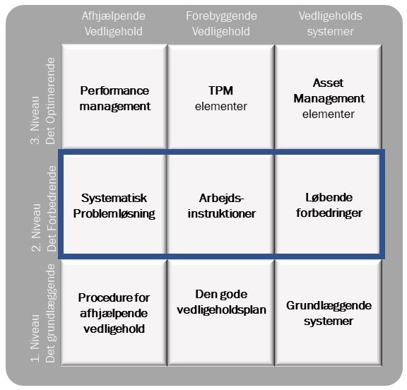 Når procedurerne og de grundlæggende systemer er på plads, bør man tage hul på de forbedrende systemer. I det grundlæggende er der meget vedligeholdsfagligt men derimod er det forbedrede niveau meget mere almennyttige tanker der benyttes. Denne del af rejsen kan derfor, og bør, gøres i et samarbejde med den øvrige organisation.