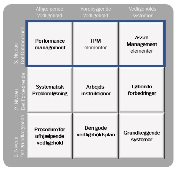 Et udtryk jeg har brugt flere gange er ”orden i eget hus”. Når vi kommer til det optimerende niveau, så er vi ved at være der. Det er her man kan begynde at inkludere lidt flere stakeholders i sin strategi. Det er naturligvis en forudsætning at man hele tiden kommunikere med sine kollegaer om hvor man er på vej hen, men her kan man inkludere dem mere i opgaverne. Performance management opfordrer derfor til synlige tavler og OEE. Sidstnævnte er jo netop et super værktøj til at kigge holistisk på udstyret og arbejde tværfagligt på det der skaber størst værdi. I TPM-afsnittet arbejder vi med Nyt udstyr og operatørudført vedligehold. Igen så må man have sine kollegaer i produktionen og ingeniørerne med. I afsnittet om Asset Management så er det rigtig meget ingeniørerne eller Engineering der er med inde over men også finans og indkøb skal bidrage mere.